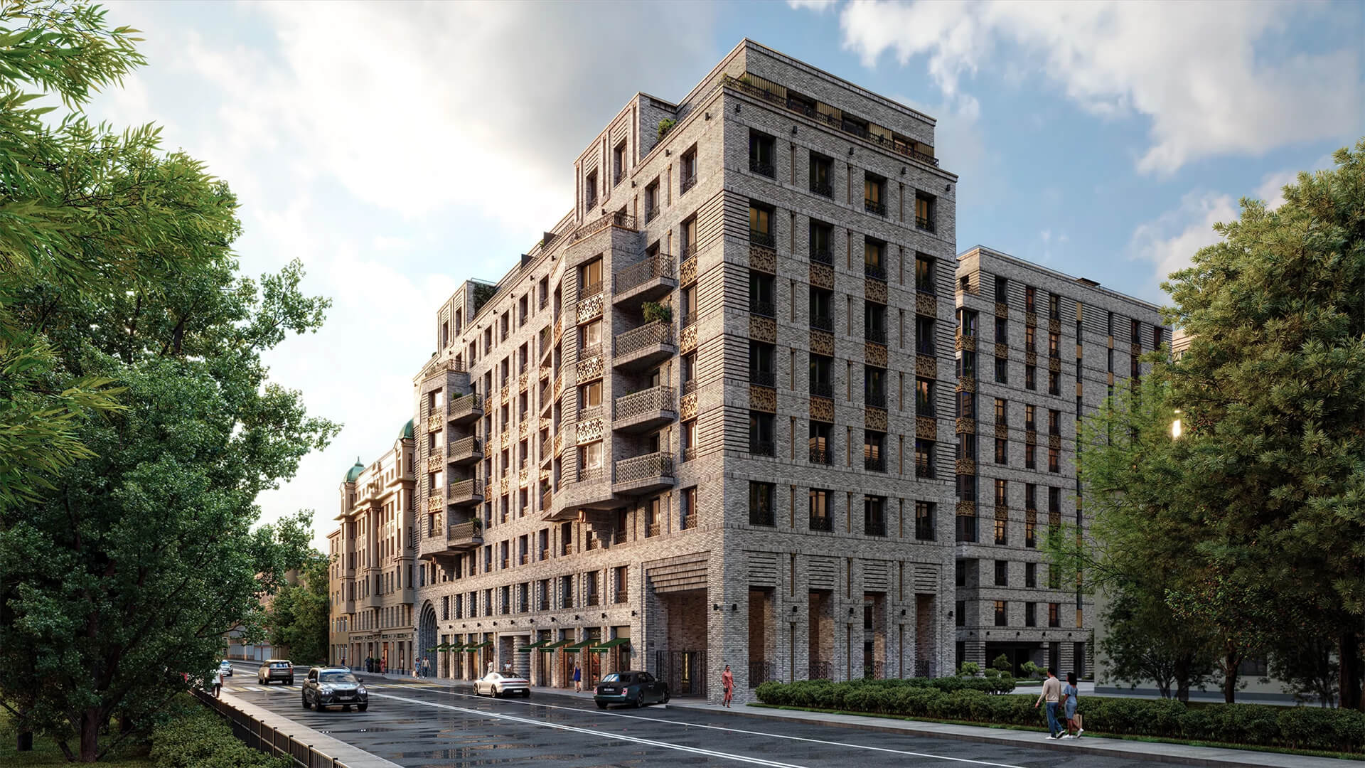 Фасады освещаются системой архитектурной подсветки, придающей зданию выразительность в любое время суток. Эркеры и арки подчёркивают границы частных пространств и создают иллюзию дополнительного объема. В каждой детали — будь то ограждения, материалы или пропорции — ощущается внимание к традиции и стремление к совершенству. Этот проект — не просто архитектура, а художественное высказывание о жизни в Петербурге.