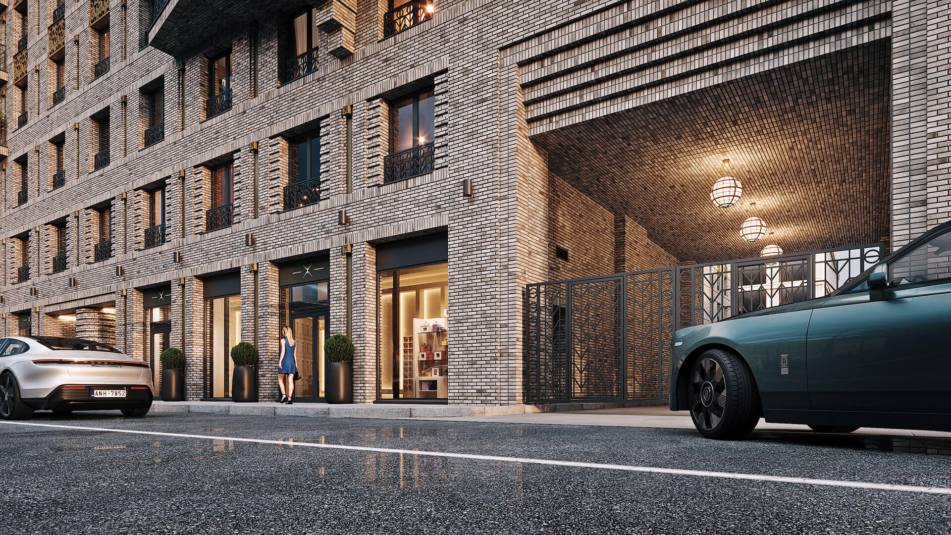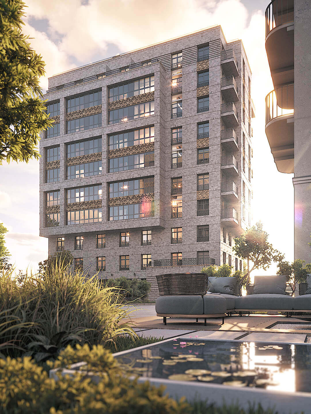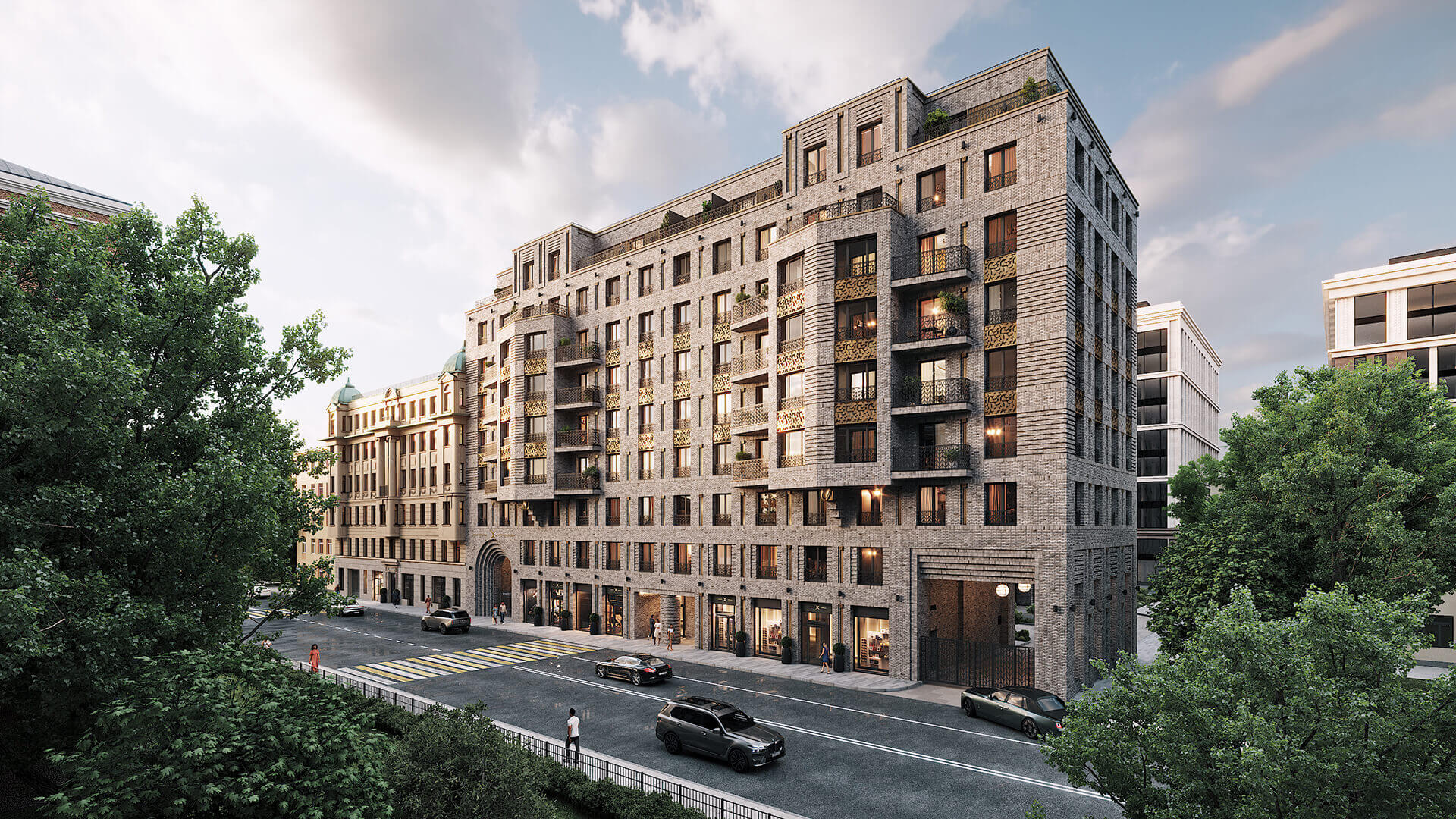 Фасады освещаются системой архитектурной подсветки, придающей зданию выразительность в любое время суток. Эркеры и арки подчёркивают границы частных пространств и создают иллюзию дополнительного объема. В каждой детали — будь то ограждения, материалы или пропорции — ощущается внимание к традиции и стремление к совершенству. Этот проект — не просто архитектура, а художественное высказывание о жизни в Петербурге.