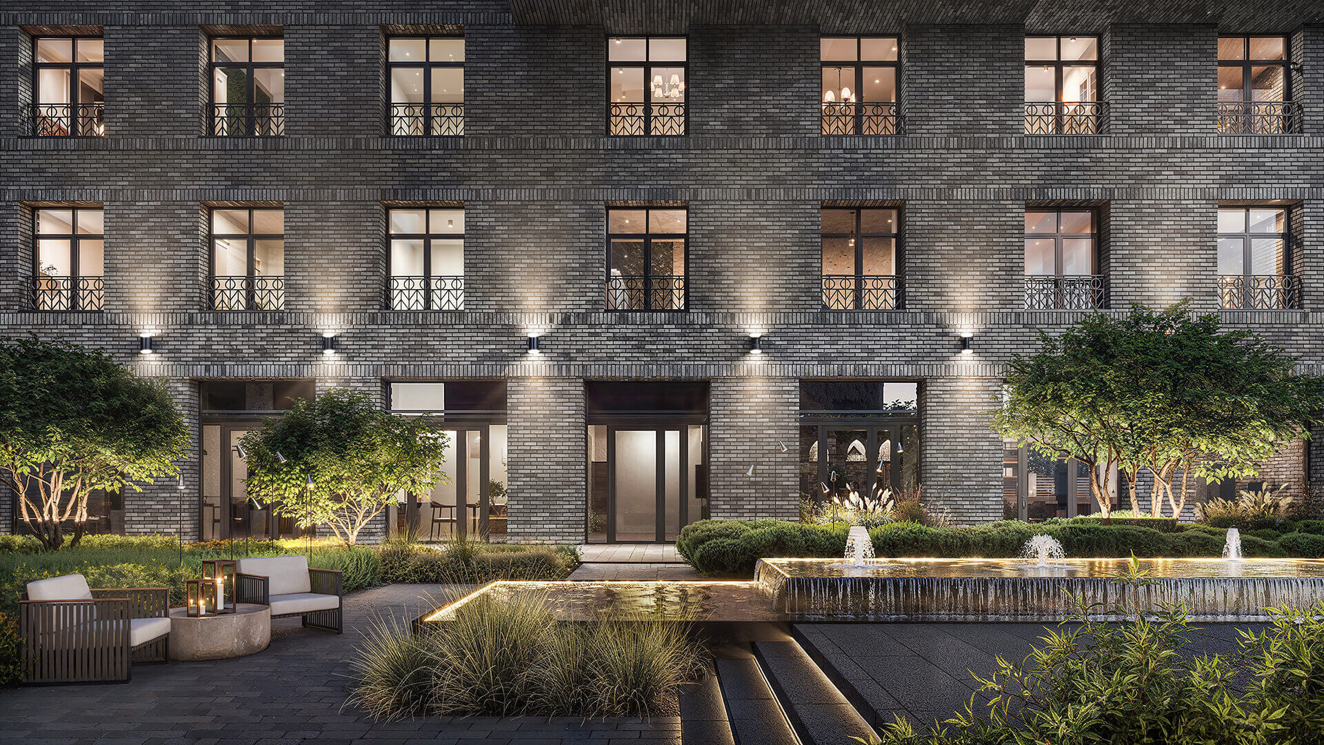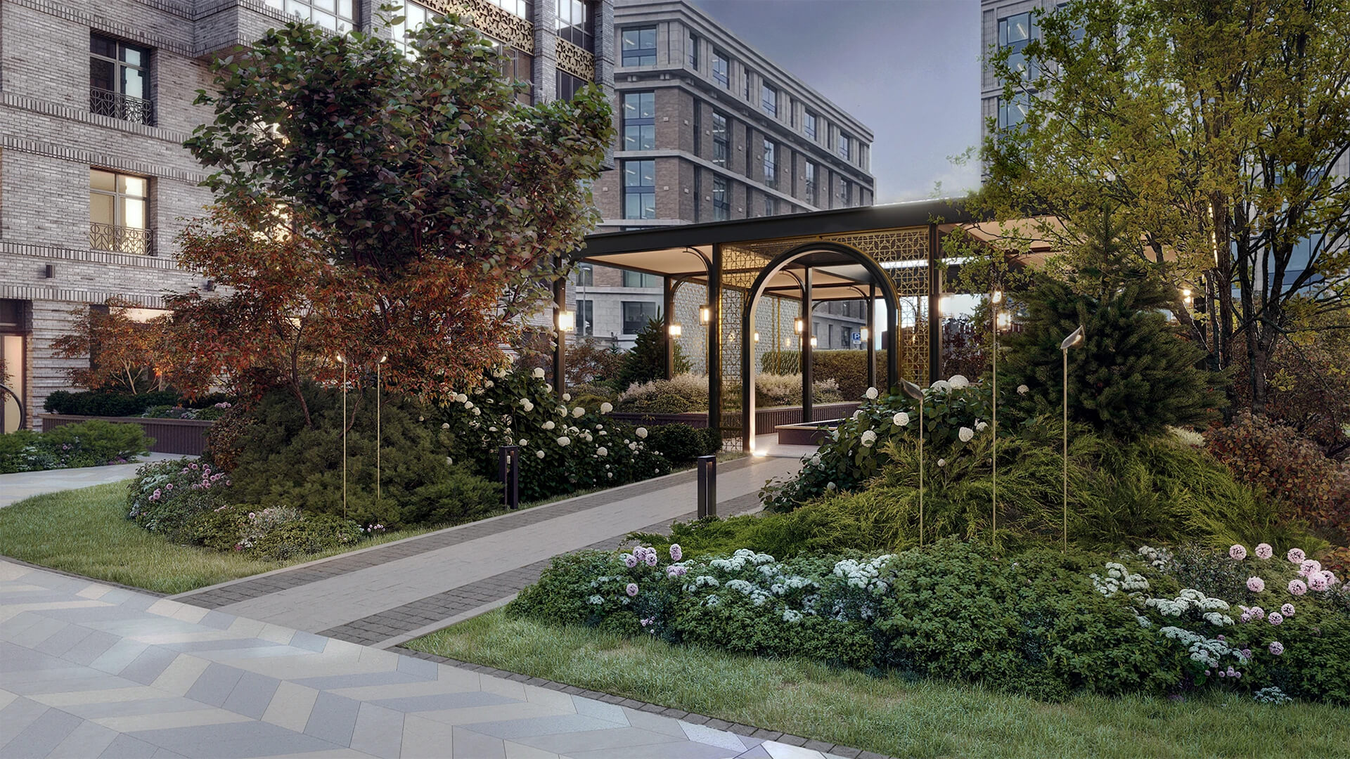 Особое внимание уделено приватности: территория комплекса закрыта от посторонних, а ландшафтный дизайн направлен на создание уединённой атмосферы. Эстетика благоустройства строится на спокойных линиях, выразительной растительности и натуральных материалах, подчеркивающих премиальность среды. В вечернее время включается сценарная подсветка, создающая романтическое настроение и визуально выделяющая архитектурные элементы зданий и садов.