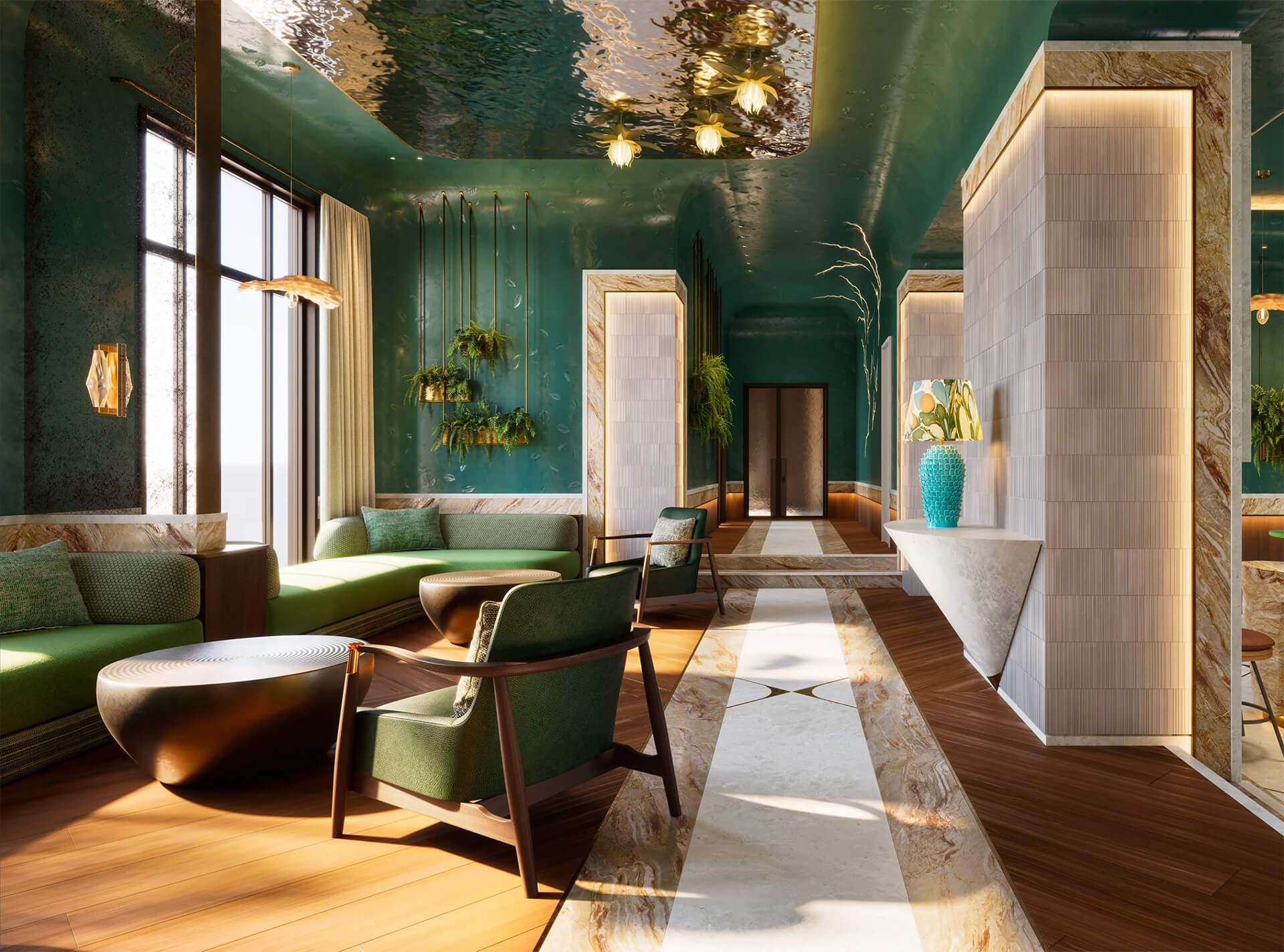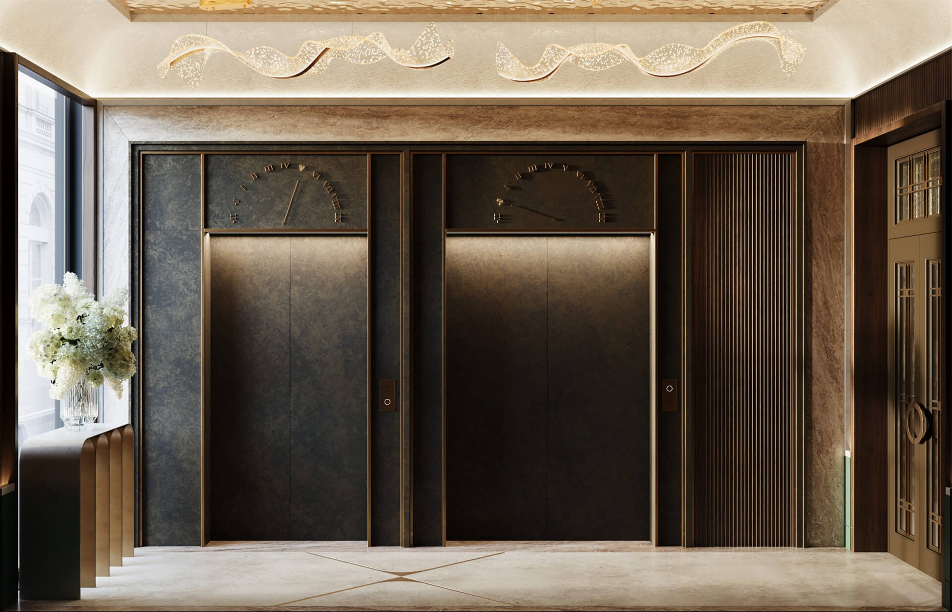 Лобби и общественные пространства квартала «Моисеенко 10» разработаны именитой британской архитектурной студией LAMBART & BROWNE, специализирующейся на интерьерах класса люкс. Их подход заключается в создании не просто функциональных помещений, а эстетически завершённых пространств, которые задают настроение и атмосферу с первых шагов. Здесь интерьер встречает гостей благородными материалами — мрамором, кварцем, латунью, натуральной кожей — и тщательно подобранной палитрой природных оттенков: нефритового, охристого, песочного и белого.